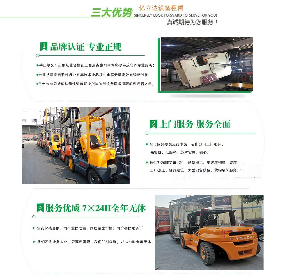 亿立达设备租赁有限公司是工商局准许的北京林业大学专业叉车出租公司,公司本着诚信、服务、效率、创新的经营理念,用精湛的技术,真诚的服务,为众多客户提供优质的服务,同时获得信赖与支持。专业提供北京林业大学3-20吨叉车出租、叉车租赁、设备搬运、集装箱掏箱装箱、机器移位定位、货物装卸、工厂搬迁、安全可靠,收费透明,价格便宜,随叫随到,24小时上门服务!本公司叉车吊车师傅对各种设备搬运装卸都有深刻探讨和研究。很多的疑难设备搬运,通过我公司的叉车师傅都能迎刃而解。对各种进口设备、国产机器、大型设备搬迁、高难度搬迁、各种精密仪器、医疗设备、科研设备等都能搬运; 提供全市 24 小时上门装卸搬运服务。同时提供厂房搬迁服务。 ...